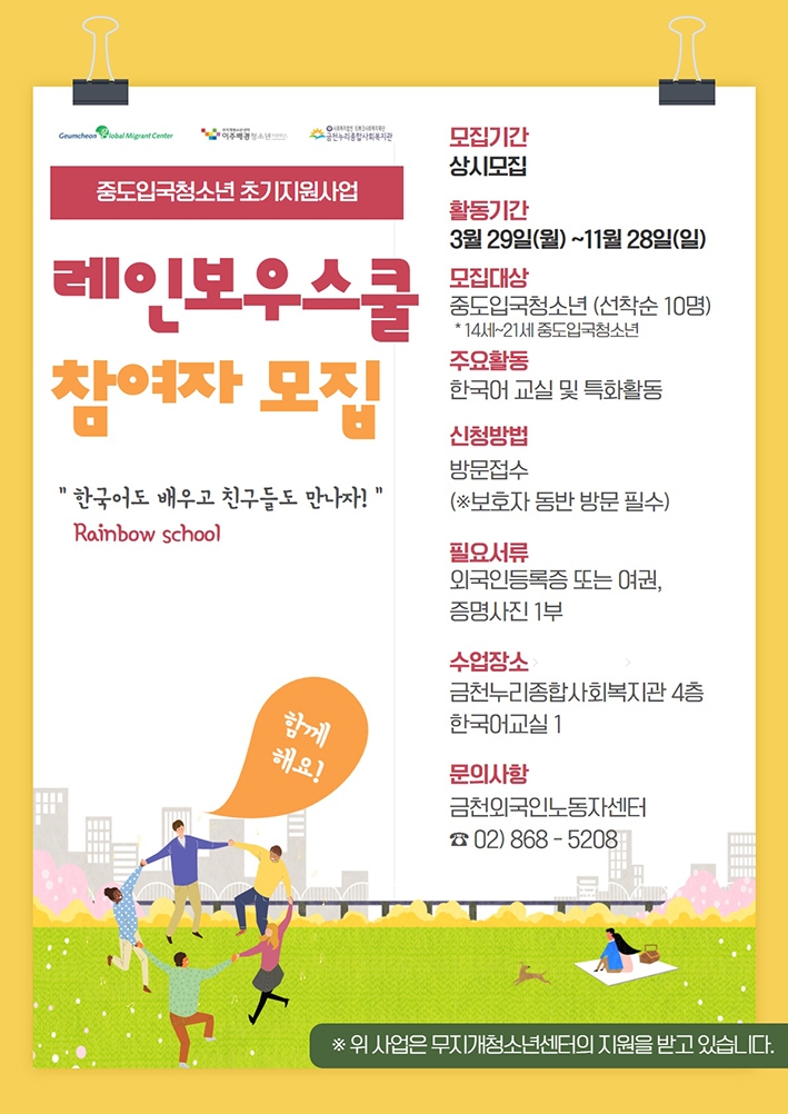 ±Ýõ´©¸®Á¾ÇÕ»çȸº¹Áö°ü¡¤±Ýõ¿Ü±¹Àγ뵿ÀÚ¼¾ÅÍ´Â 14~21¼¼ Çб³ ¹Û ÀÌÁÖ¹è°æÃ»¼Ò³âÀ» ´ë»óÀ¸·Î ÆòÀÏ(¿ù~±Ý) ¿ÀÀü 10½ÃºÎÅÍ ¿ÀÈÄ 5½Ã±îÁö ÀüÀÏÁ¦ ¹ÝÀ» ¿î¿µÇϰí ÀÖ´Ù. ¿ÃÇØ´Â Áö³ 3¿ù29ÀϺÎÅÍ 11¿ù28ÀϱîÁö ÃÑ 32ÁÖ°£ ½ÃÇàµÉ ¿¹Á¤À̸ç, ÇöÀç ¼±Âø¼øÀ¸·Î ¹æ¹®Á¢¼ö¸¦ ¹Þ°í ÀÖ´Ù.