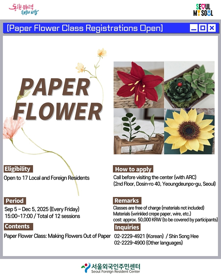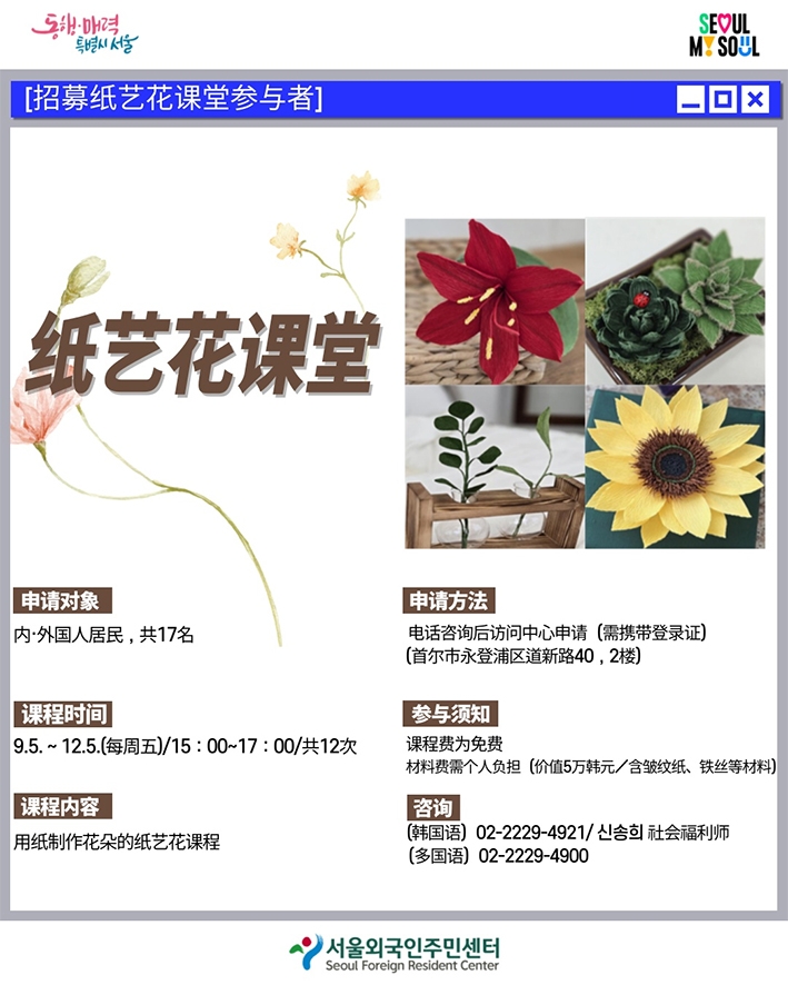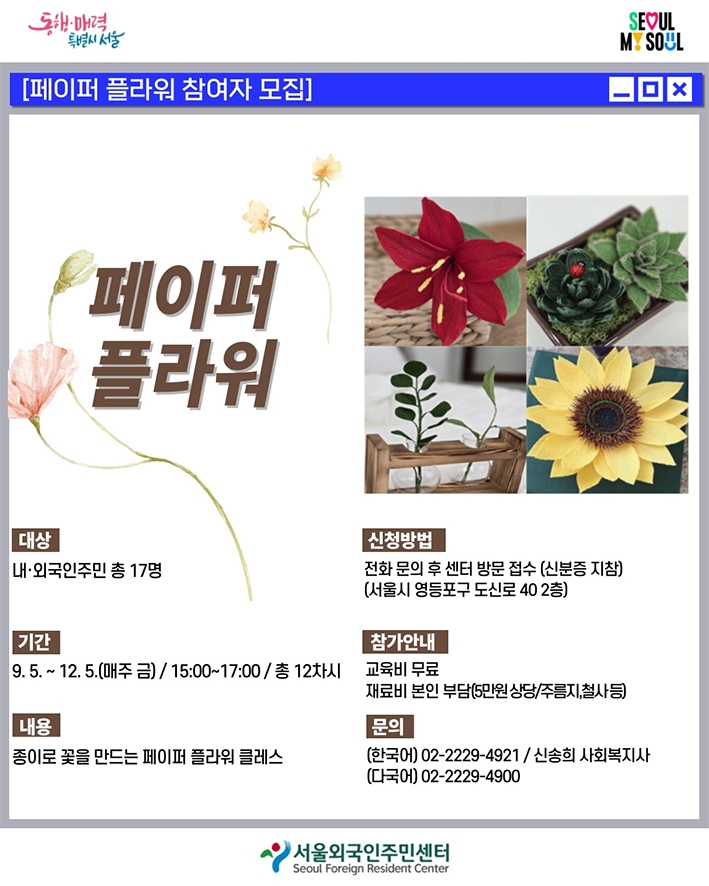 ¼¿ï¿Ü±¹ÀÎÁֹμ¾ÅÍ(¼¾ÅÍÀå: ±èµ¿ÈÆ)Àº ¿À´Â 9¿ù5ÀϺÎÅÍ 12¿ù5ÀϱîÁö ¸ÅÁÖ ±Ý¿äÀÏ ¿ÀÈÄ 3½ÃºÎÅÍ 5½Ã±îÁö ÃÑ 12ȸ¿¡ °ÉÃÄ ³»¡¤¿Ü±¹ÀÎÁֹΠ17¸íÀ» ´ë»óÀ¸·Î Á¾ÀÌ·Î ²ÉÀ» ¸¸µå´Â ¡®ÆäÀÌÆÛ Çöó¿ö Ŭ·¹½º¡¯ ±³À°À» ½Ç½ÃÇÑ´Ù°í ¹àÇû´Ù.
