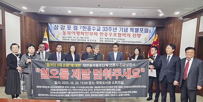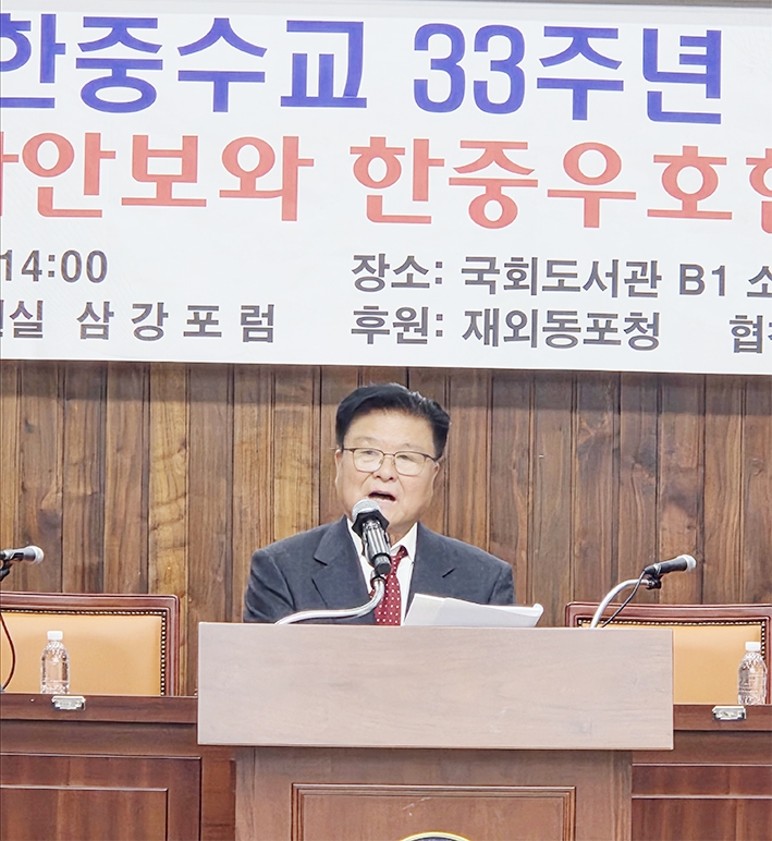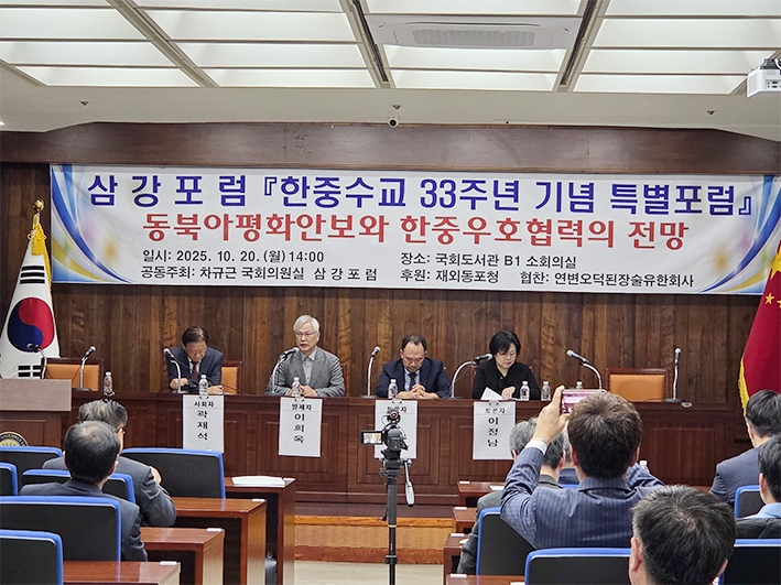 »ï°Æ÷·³(»óÀÓ´ëÇ¥ °ûÀç¼®, °øµ¿´ëÇ¥ Àå°æ·ü)°ú Â÷±Ô±Ù ±¹È¸ÀÇ¿ø½ÇÀÌ °øµ¿ÁÖÃÖÇϰí Àç¿Üµ¿Æ÷ûÀÌ ÈÄ¿ø, ¿¬º¯¿À´öµÈÀå¼úÀ¯ÇÑȸ»ç°¡ ÈÄ¿øÇÑ <ÇÑÁß¼ö±³ 33Áֳ⠱â³ä Ưº°Æ÷·³>ÀÌ ¡®µ¿ºÏ¾ÆÆòȾȺ¸¿Í ÇÑÁß¿ìÈ£Çù·ÂÀÇ Àü¸Á¡¯À̶ó´Â ÁÖÁ¦·Î 20ÀÏ ±¹È¸µµ¼°ü ÁöÇÏ 1Ãþ ¼ÒȸÀǽǿ¡¼ ¿·È´Ù.